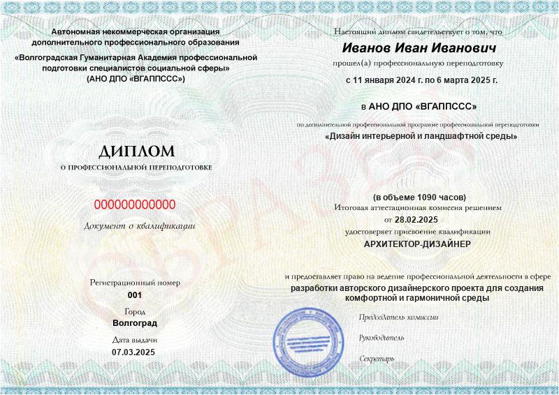 Обучение по такой программе – способ освоить новую профессию на основе ранее полученного образования. В дипломе выпускника указывается его ФИО, наименование учебной организации, название и длительность программы. Документ заверяется подписью руководителя и печатью АНО ДПО «ВГАППССС».