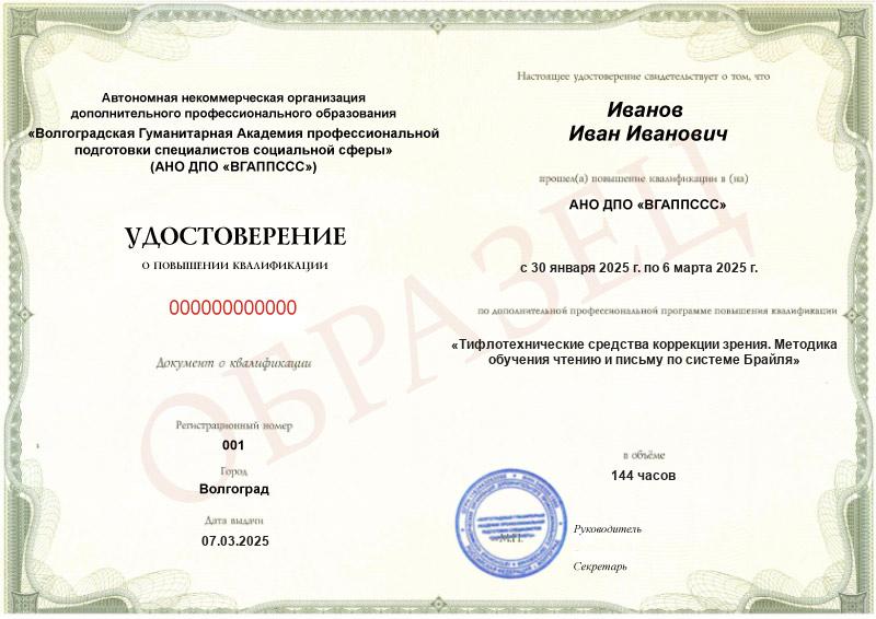 Тифлотехнические средства коррекции зрения. Методика обучения чтению и письму по системе Брайля (144ч)